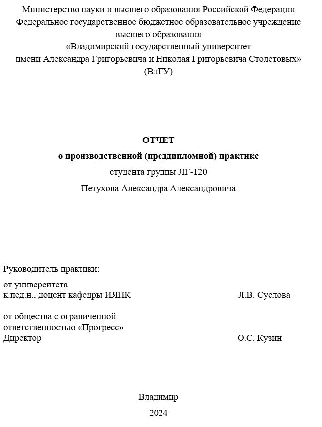 Ниже представлен образец титульного листа отчета о производственной практике.