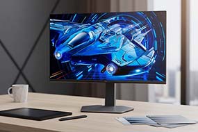 Таким образом, монитор воспроизводит глубокий чёрный цвет и выразительные световые акценты. Яркость экрана составляет 600 нит (кд/м²), при этом он потребляет меньше энергии по сравнению с моделями с традиционными LED-матрицами.