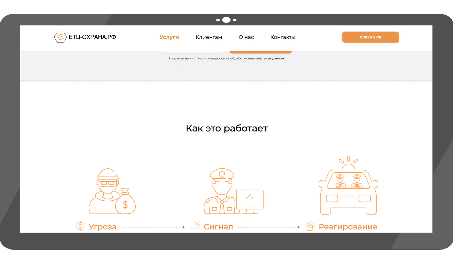 Система «ЕТЦ-охрана» включает сигнализацию с датчиками проникновения и тревожные кнопки, которые передают сообщения на пульт централизованного наблюдения. После получения сигнала к объекту выезжает экипаж вневедомственной охраны Росгвардии. В городской черте время прибытия составляет 5–10 минут, за городом — до 15 минут.