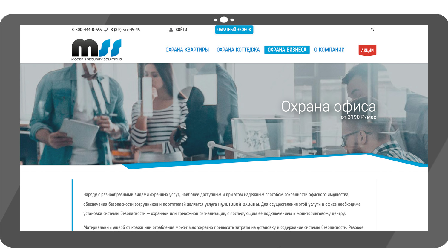 Modern Security Solution — система пультовой охраны для офисов и коммерческих помещений. Она предназначена для защиты имущества и персонала. При срабатывании датчиков сигнал поступает в мониторинговый центр, и оператор направляет на объект группу быстрого реагирования.