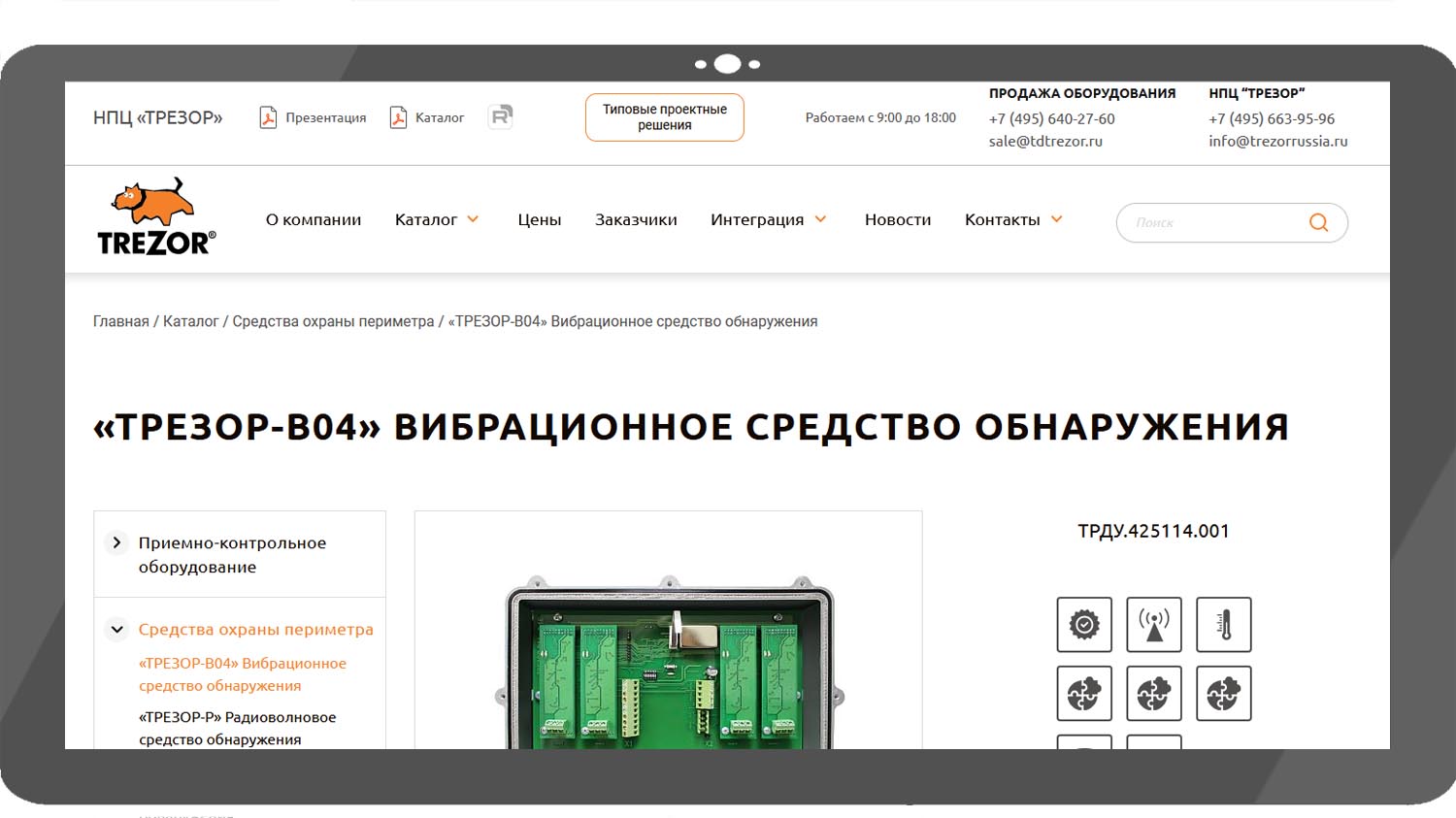 «Трезор-В04» — вибрационная система охраны периметра. В ее основе — трибоэлектрический кабель. При внешних воздействиях или деформации проводники внутри него трутся друг о друга, в результате создается импульс. Система реагирует на попытку перелезть через забор, разрушить его, перекусить провод или сделать подкоп, передавая сигнал в электронный блок.