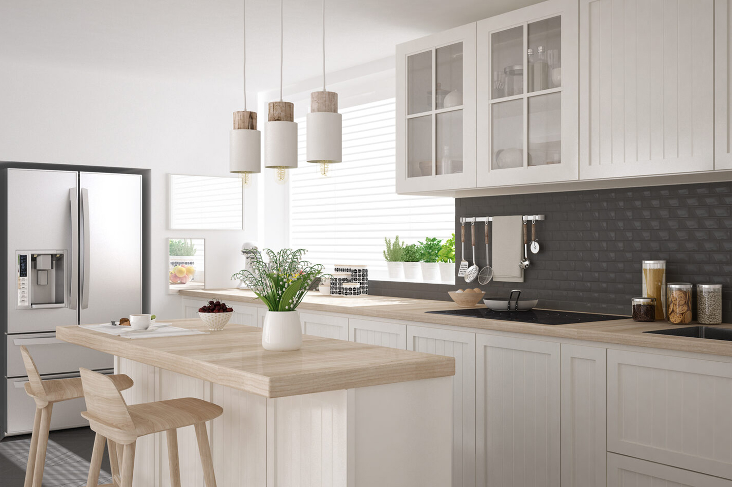 «Деревянная столешница и бежевая кухня – это вариант скандиновского стиля или кухни в стиле «прованс». Весьма неплохо! Подчеркивает не только стилевые решения, но и по своей стоимости столешница такого плана позволяет «закрыть» бюджет заказчику».