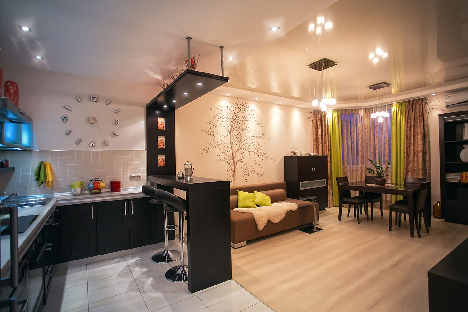Огромные канделябры в студии — явно не дело. Лучше подойдут многочисленные лампочки и диоды. Разделение освещением пространства — тоже неплохой вариант. Например, в гостиной можно использовать потолок с неоновой подсветкой, а на кухне — несколько встроенных в интерьер лампочек. Подойдет вариант и с разными цветами неоновых потолков в разных местах квартиры. Для спальни и гостиной хорошо подойдет мягкое освещение, которое создаст надлежащую атмосферу для отдыха.