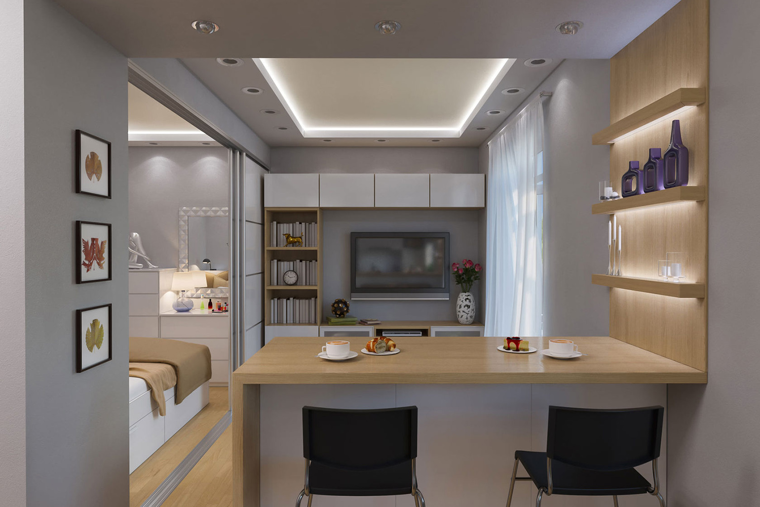 Работать с малым пространством, как это не парадоксально, значительно сложнее, чем создавать интерьер большой квартиры. Дизайн студии требует максимально детальной проработки и продумывания всех возможных функций каждой зоны. Главная ошибка, которую допускают в дизайне студий, — это отсутствие дизайнера. Непрофессионал, столкнувшись с этой задачей, не сможет учесть и половины того, что мог бы предусмотреть опытный дизайнер и архитектор. Грамотное планирование зон, инженерия (коммуникации, электрика), сочетание цветов, естественного и искусственного освещения, правильные интерьерные решения — это основные задачи, которые решает дизайнер. Если допустить ошибки, то в маленьком пространстве сразу будет заметен диссонанс. Непрофессионалы, как правило, сильно ошибаются в комбинации цветов, сводя в интерьере явно негармонирующие цвета и фактуры, возводят визуальные преграды в виде столов или диванов, которые рушат и ломают пространство, устанавливают угловую мебель (угловые шкафы), которая также во многом портит весь вид, перегружают пространство, размещая крупную мебель.