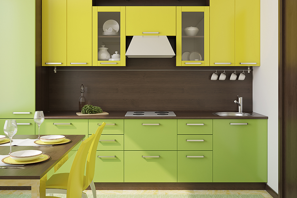 Сочетание зеленого и желтого в природе встречается часто. Для современной кухни его тоже можно использовать, например, в отделке, мебели и аксессуарах. Но делать это нужно осторожно, так как комбинация желтого и зеленого довольно опасна особенно, когда оба этих оттенка очень насыщенные и яркие.