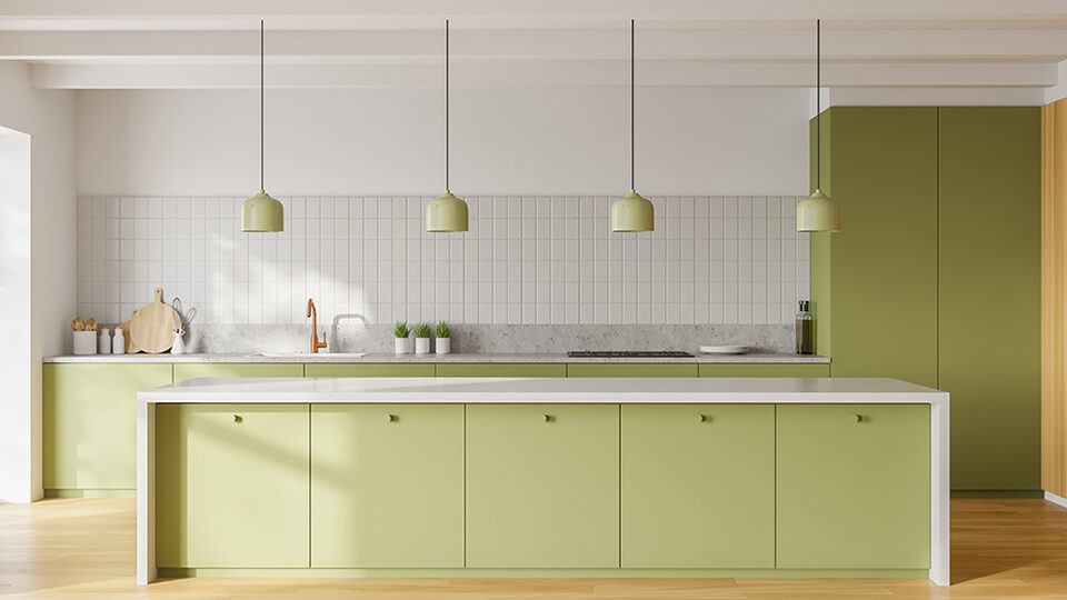 Со светлыми оттенками сложно прогадать. Это хороший вариант для оформления кухни любой площади и стиля. Светло-зеленые оттенки прекрасно подходят для фасадов корпусной мебели, а также для обеденной группы или аксессуаров. Наиболее актуальные варианты цветов – фисташковый, мятный и светло-оливковый.