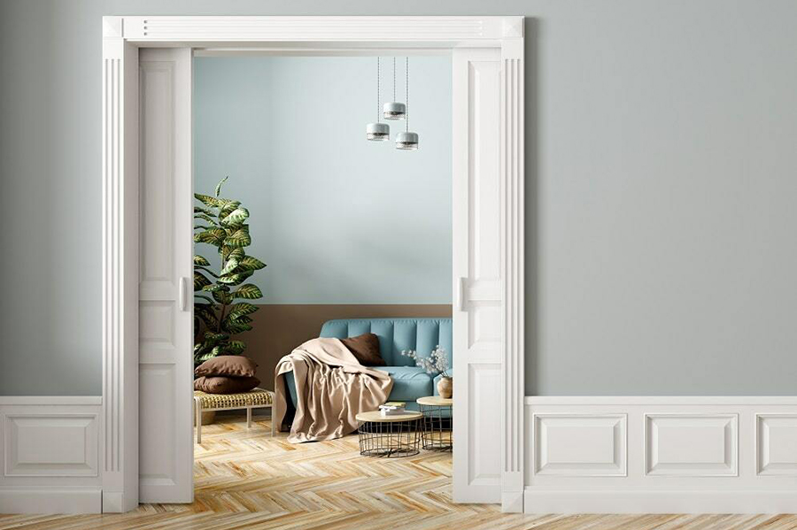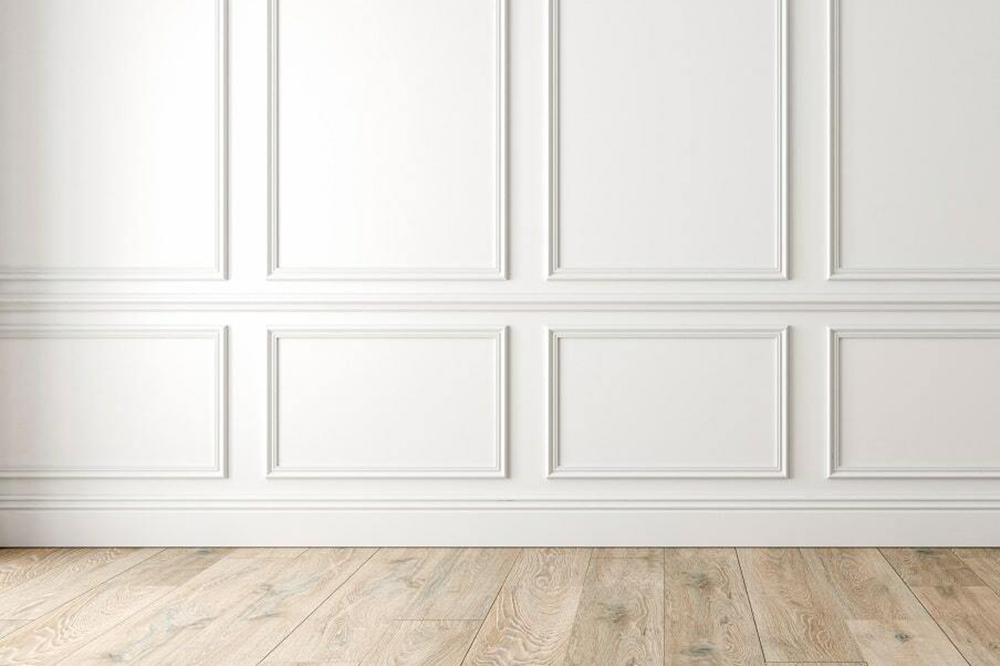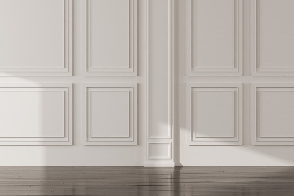 При отделке стен используются белые молдинги, которые обрамляют вставки, отличающиеся от общего фона. Они придают пространству классическую строгость линий и упорядоченность.