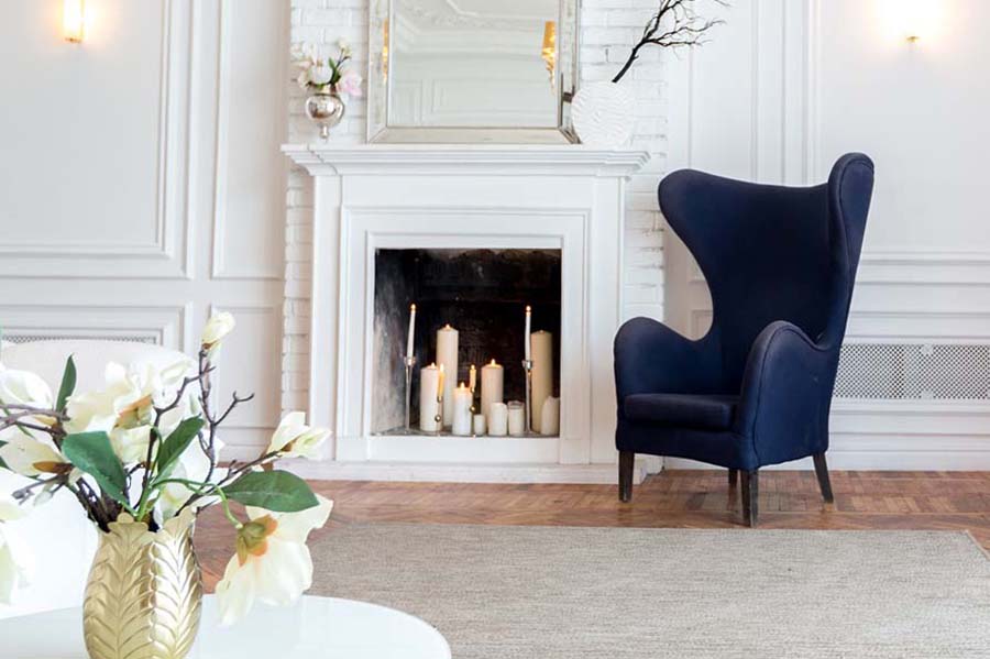 Важным атрибутом интерьера является камин, который желательно встраивать в мраморный портал. Он отличается изысканностью, украшается канделябрами, сложной резьбой и имитацией колонн.
