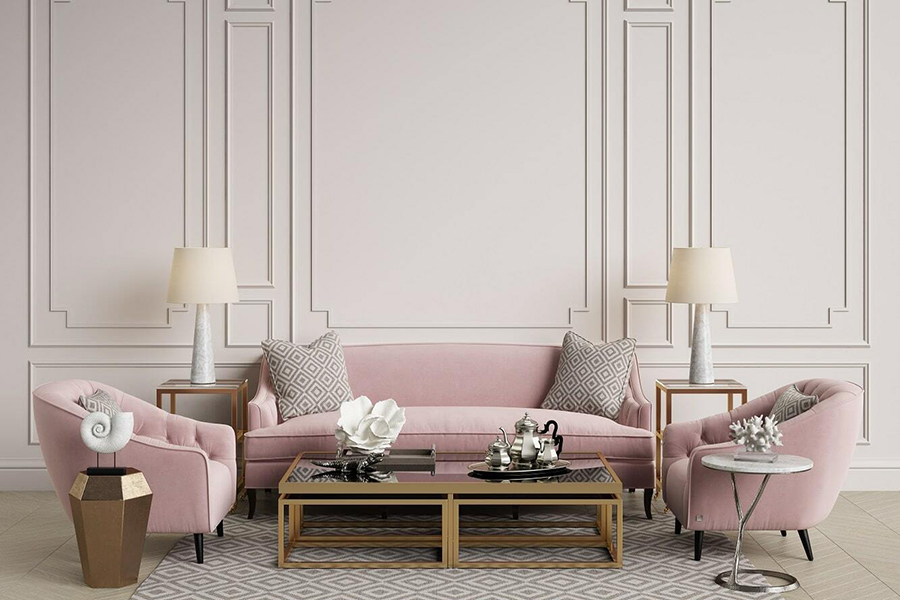 В мебели используется принцип симметрии, для чего необходимы парные предметы. Кресла располагаются рядом с диваном, пуфы и банкетки соседствуют со столиком. Роскошную обивку мягкой мебели не принято прикрывать покрывалами и накидками. Кресла и диваны имеют изогнутые ножки, плавные линии и высокие спинки.
