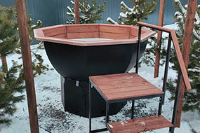 Армированная крышка дополняется теплоизоляционным слоем: это позволяет сохранять тепло внутри чаши. Печь с зольным отсеком и колосником толщиной 20 мм и объемом 300 л вмещает значительный объем дров за одну закладку. Встроенный кран позволяет подсоединить шланг для слива воды. Вы также можете добавить лестницу: приставную с поручнями или на металлокаркасе с площадкой. Деревянные элементы обработаны защитным составом, который предотвращает повреждение материала жуками-древоедами и увеличивает срок службы изделия.