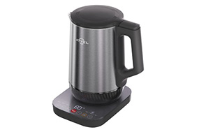 Это устройство можно назвать даже не электрическим чайником, а целой системой для чаепития. В комплекте с электрочайником идет подставка с сенсорным управлением и заварочный чайник. Для последнего даже предусмотрена зона с подогревом. Сам электрочайник выполнен из стекла и пластика, который замаскирован под металл. Функционал тоже достаточно модный — есть тут и поддержание тепла, и плавная терморегуляция, и экран, который отображает текущую температуру воды.
