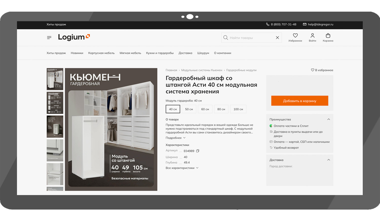 LOGIUM «Асти 40» — модульная гардеробная система, гармонично вписывается в интерьер любого стиля — от классического до лофта. Конфигурацию можно создать индивидуальную, выбрав модули с ящиками, полками, штангами нужной вам ширины: 40, 50, 60, 80 или 100 см. Благодаря чему гардеробная подходит для установки даже в нестандартную нишу.
