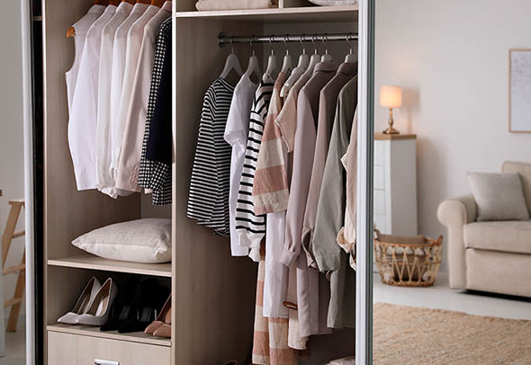 Системы для хранения могут быть открытыми и закрытыми. Первые способствуют хорошей вентиляции, но стоит понимать, что они требуют поддержания идеального порядка. Минус конструкции — скопление пыли на вещах. Закрытые системы оснащаются дверями, которые скрывают содержимое гардероба от посторонних глаз.