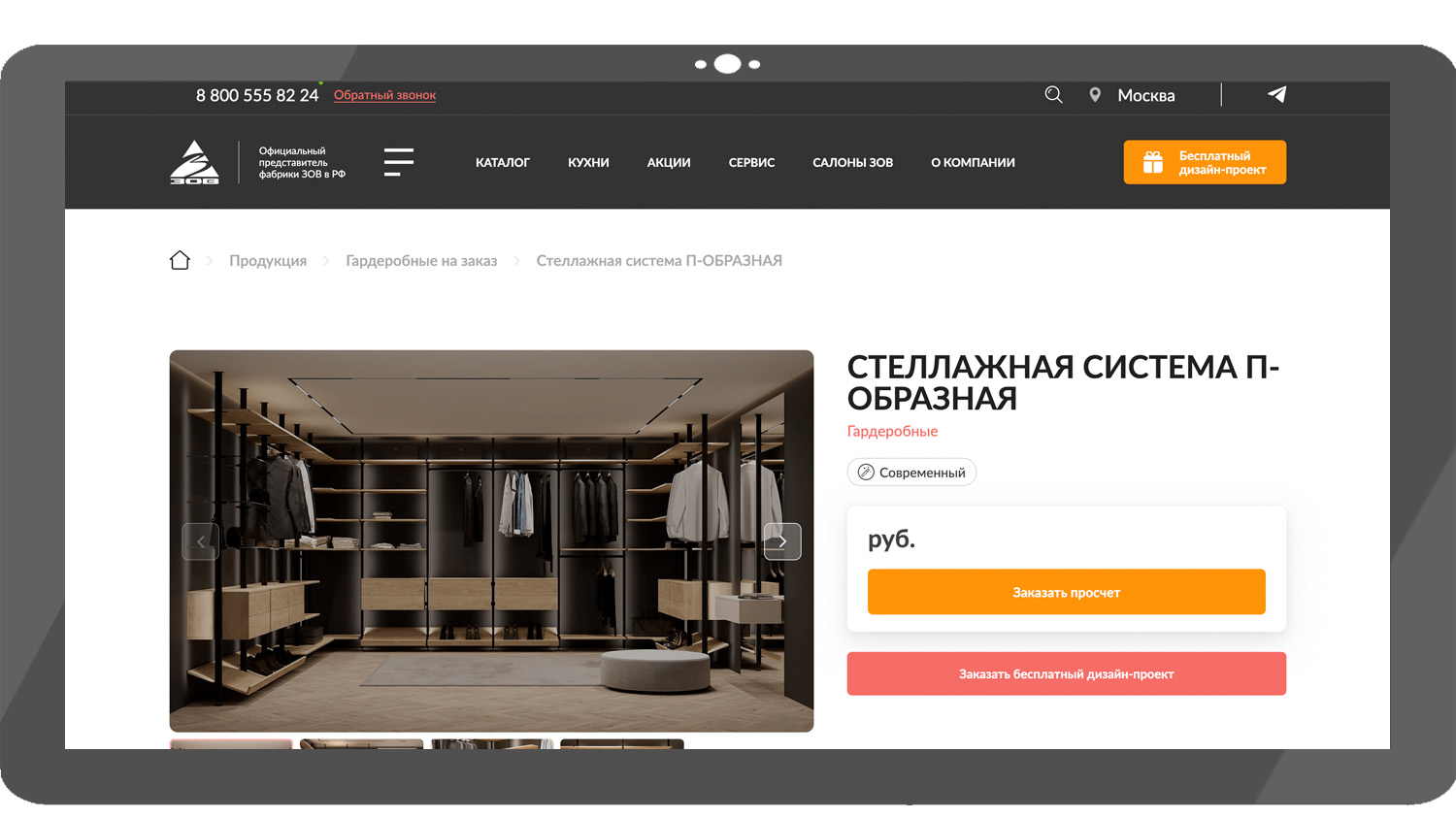 Zov-home — стеллажная система П-образной формы. Гардеробная выполнена в современном стиле и занимает три стены в комнате. Каркас изготовлен из алюминиевого профиля черного матового цвета, полки — из ЛДСП толщиной 18 мм, декоративные элементы — дуб или прозрачное стекло.