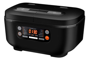 Прибор снабжен 5-литровой чашей увеличенной толщины 1,8 мм (по сравнению со стандартной 1 мм). Антипригарное покрытие DAIKIN не дает продуктам прилипать к емкости и упрощает очистку чаши. Для безопасности и удобного ухода предусмотрены съемные внутренняя крышка и паровой клапан. У модели электронное управление, об этапах готовки сообщает индикатор. Есть функции отсрочки старта до 24 часов и разогрева блюд.