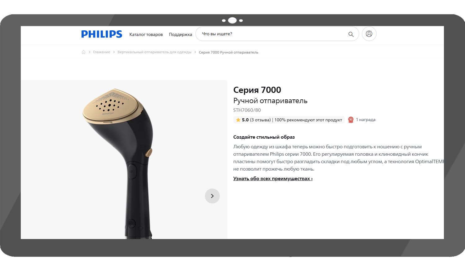 Ручная модель Philips 7000 Series STH7060/80 предназначена для вертикального и горизонтального отпаривания и готова к работе уже через 30 секунд после включения. Мощность прибора составляет 1 500 Вт. В результате нагрева образуется пар, выходящий со скоростью 28 г/мин. Он подается в двух режимах: Eco (для экономии воды) и Max (большая мощность пара). Благодаря регулируемой головке и клиновидному кончику подошвы удается разгладить труднодоступные места на одежде: оборки, складки, воротнички, участки вокруг застежек. Технология OptimalTEMP позволяет в автоматическом режиме корректировать температурные показатели в зависимости от типа ткани, что исключает повреждение вещей.
