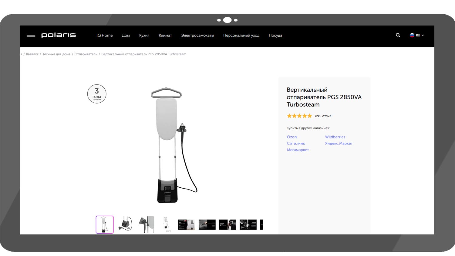 Главной особенностью модели является керамическая нагреваемая до 140 °С пластина, которая позволяет использовать отпариватель горизонтально как утюг, при этом сохраняя бережный подход отпаривателя.