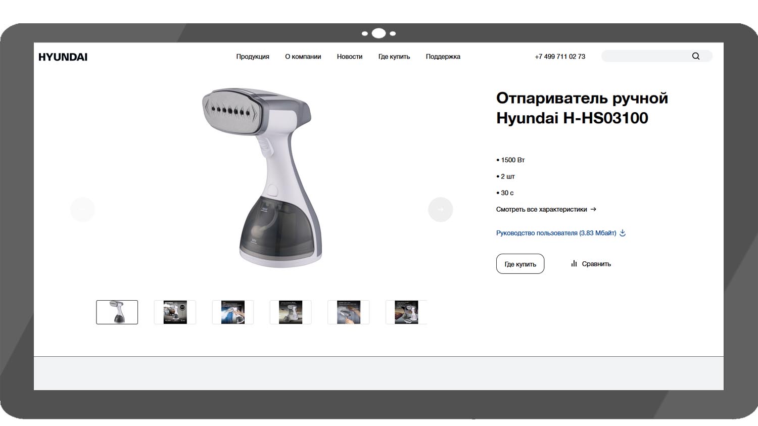 Ручная модель Hyundai H-HS03100 мощностью 1 500 Вт генерирует пар в двух режимах с максимальной интенсивностью 28 г/мин. Прибор готов к работе через 30 секунд после включения. Керамическая подошва утюжка с антипригарным покрытием позволяет использовать его как для вертикального отпаривания, так и для горизонтального глажения. Управление осуществляется с помощью кнопки на корпусе.