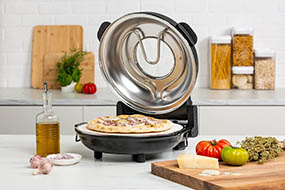 Электрический пиццамейкер — это компактный настольный прибор для быстрого приготовления самого популярного итальянского блюда в домашних условиях. Устройство сочетает функции мощного нагрева и вращения, чтобы имитировать условия настоящей дровяной печи. При этом пиццамейкер компактнее духовки или микроволновки. Прибор быстро разогревается до 400 °C (в некоторых моделях этот показатель выше или ниже). Как правило, приготовление пиццы занимает 3–8 минут. Помимо нее можно испечь фокаччу, лепешки, лаваш, тортилью, печенье. А некоторые устройства позволяют жарить омлет, мясо, рыбу, овощи и многие другие блюда, что превращает прибор в универсального кухонного помощника.