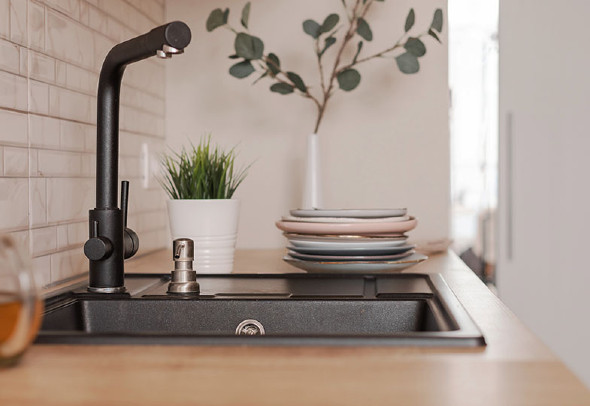 Искусственный камень не боится воды и отлично стыкуется без видимых швов. Да, он легче «царапается», чем кварц или мрамор, но это легко можно исправить полировкой. Либо можно выбрать такую столешницу, где царапины не будут заметны. Для этого нужно отказаться от однотонных, белых, темных столешниц. Лучше рассмотреть варианты с неоднородными вкраплениями или разводами нейтральных оттенков. И при заказе столешницы попросите мастера сделать полировку не слишком глянцевую, ближе к фактуре сатин.