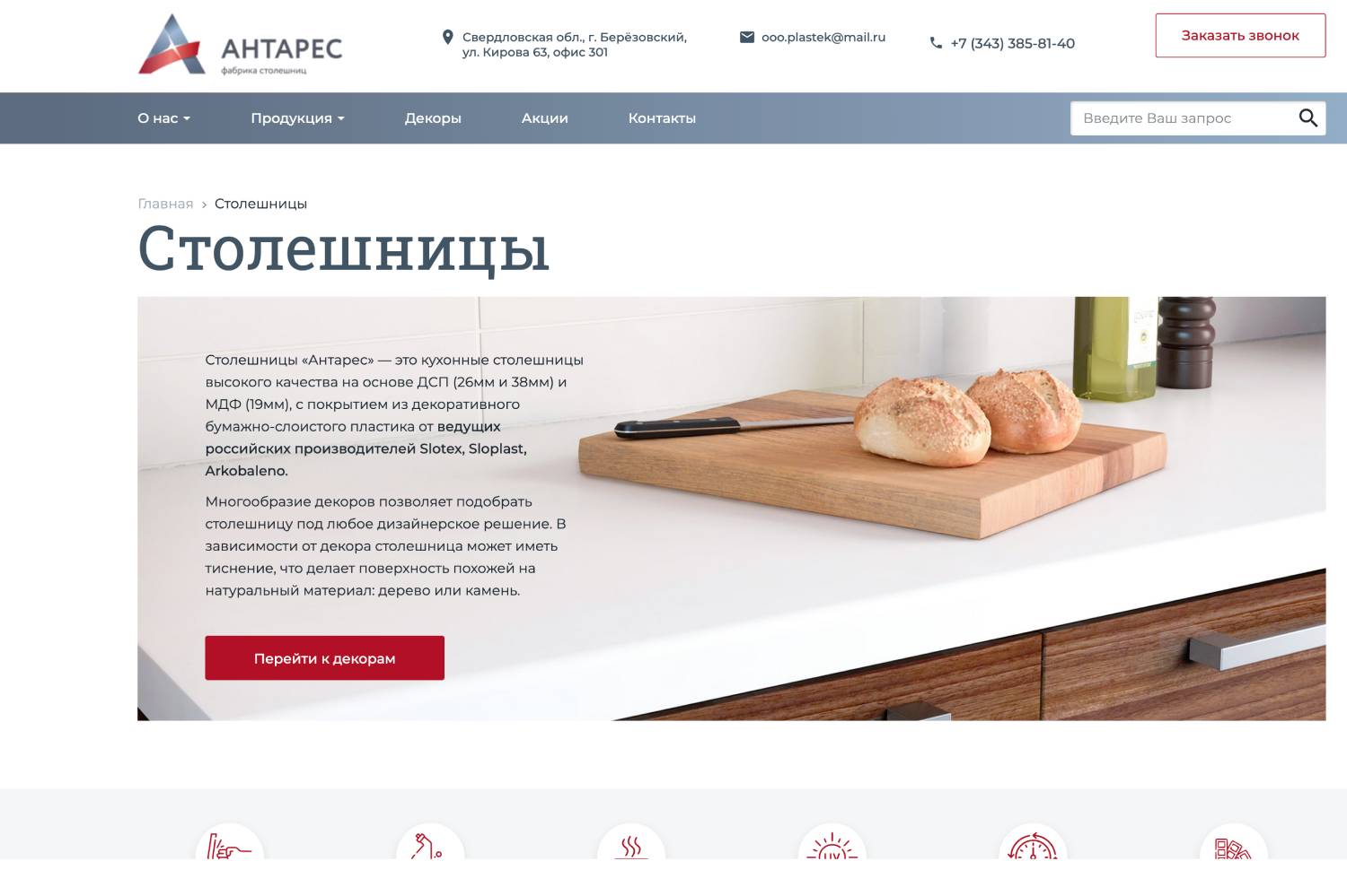 Фабрика «Антарес» основана в 2010 году в Березовском, городе-спутнике Екатеринбурга. Это один из крупнейших производителей столешниц постформинг в России. Предприятие специализируется на выпуске изделий на основе ДСП, тонких моделей из МДФ, стеновых панелей, фасадов и фасадных полотен. Выполняет и нестандартные заказы по индивидуальным проектам, подбирает и поставляет необходимую фурнитуру. Фабрика сотрудничает как с крупными производителями мебели, так и с небольшими компаниями, работающими на заказ.