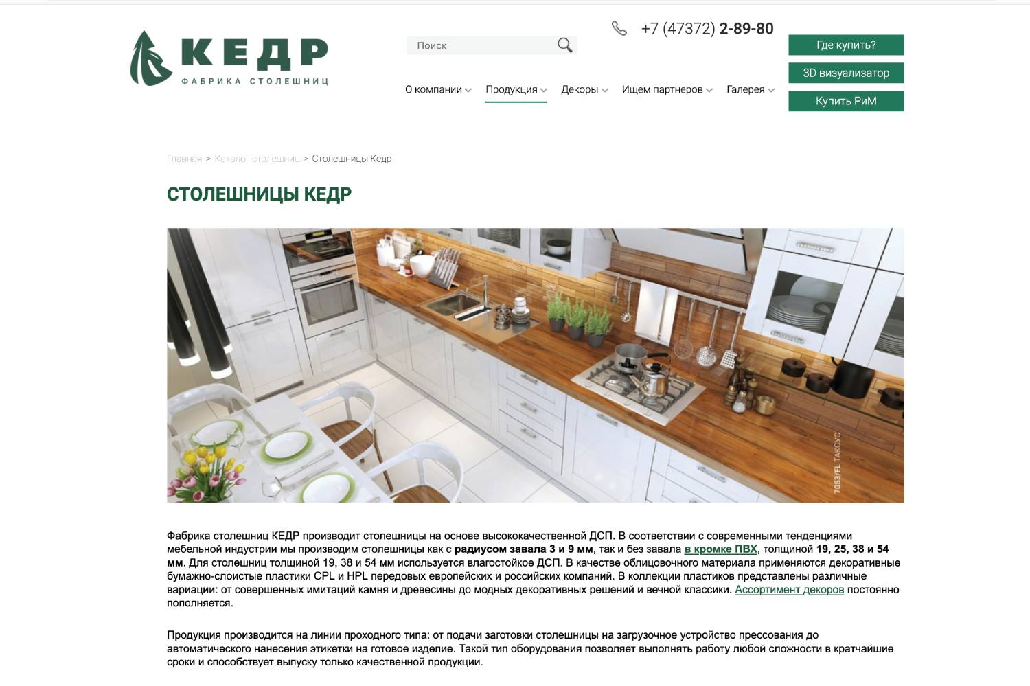 Воронежская фабрика «Кедр» производит столешницы для кухни с 1999 года. Ее официальные представительства открыты более чем в 100 городах России и 12 странах ближнего зарубежья. Компания открыта к сотрудничеству с партнерами и дилерами.