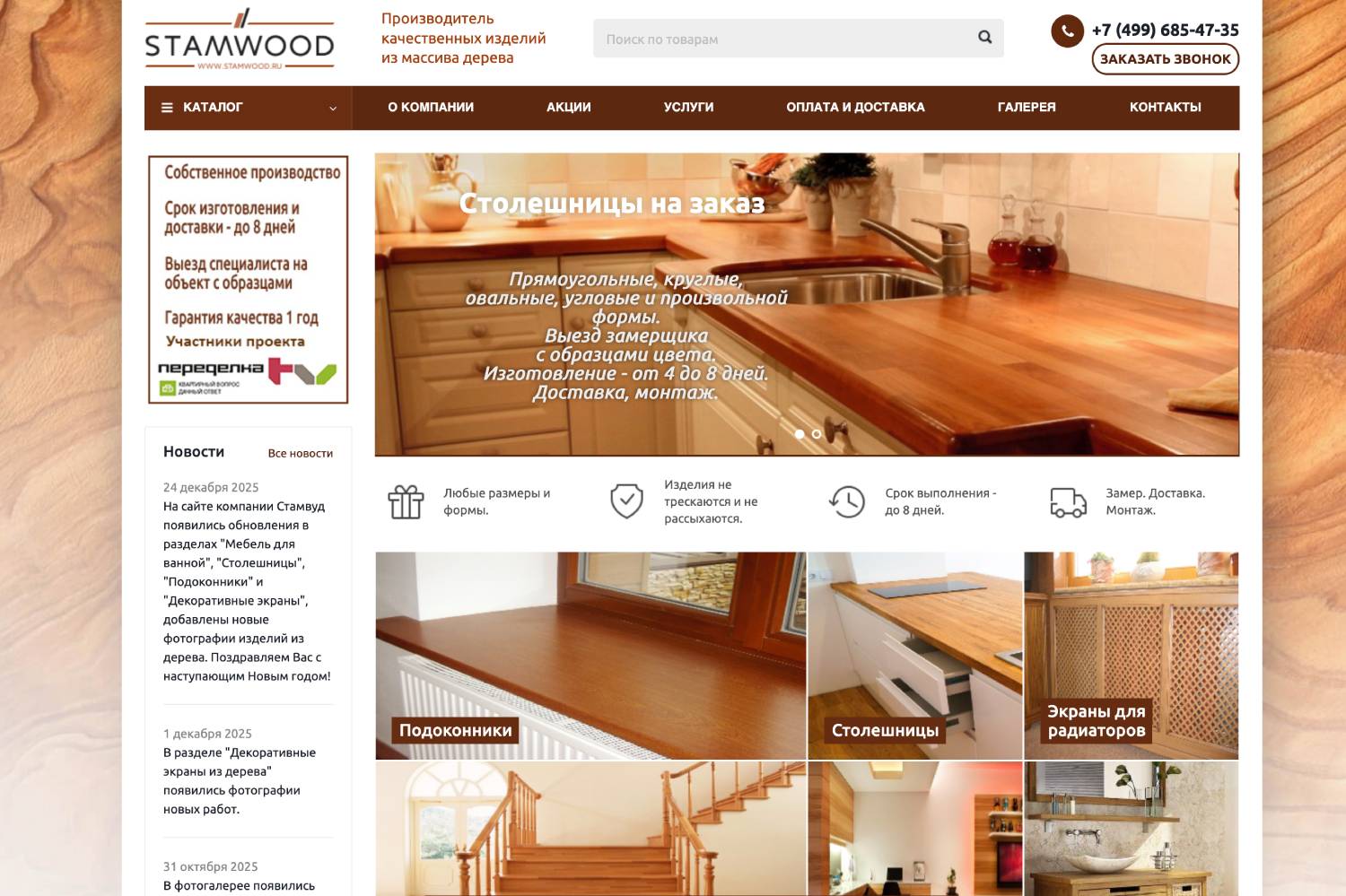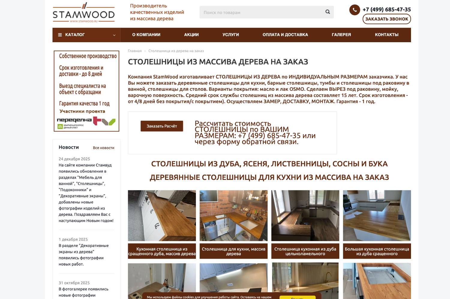 Компания Stamwood предлагает полный комплекс услуг: от распила пиломатериалов до сборки, покраски и монтажа готовых изделий. В ассортименте представлены столешницы, подоконники, ступени и подступенки для лестниц, столбы, балясины, поручни, декоративные панели и экраны, а также мебель в стиле лофт, модели для ванной комнаты, стеллажи, полки и шкафы.