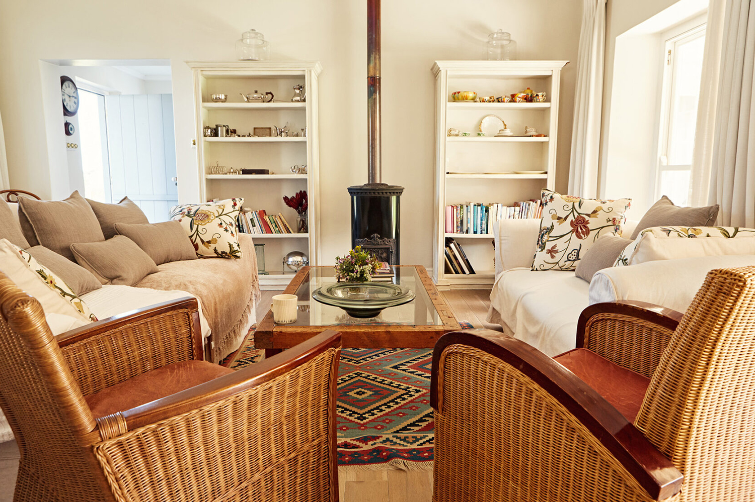 Журнальный столик, комод, прикроватные тумбы и кресла для гостиной должны формировать ощущение истории, словно они достались вам по наследству от бабушки. В гостиной поставьте книжный шкаф, а для создания уютной сельской обстановки в столовой или на кухне подберите в общую цветовую гамму плетеные кресла. Прикроватные тумбы в спальне замените старыми сундуками.