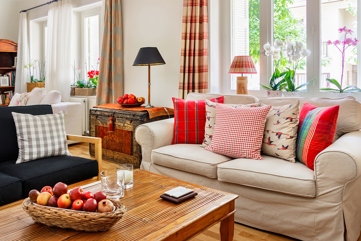 В качестве декора и аксессуаров в стиле кантри ценятся предметы, изготовленные своими руками или стилизованные под деревенский быт. Большую роль играет обилие текстиля: занавески на окнах, кружевная белая скатерть на столе, салфетки в клеточку на комоде, шерстяной плед на диване, небольшие подушки на софе и креслах.