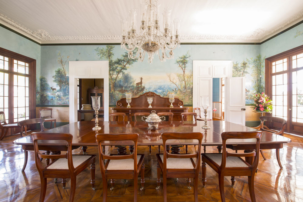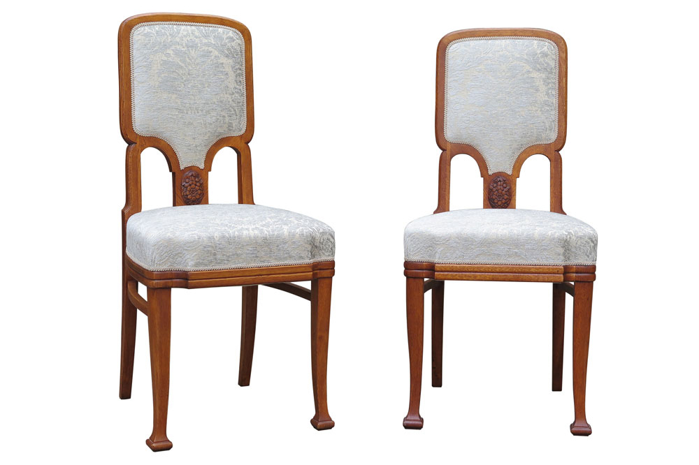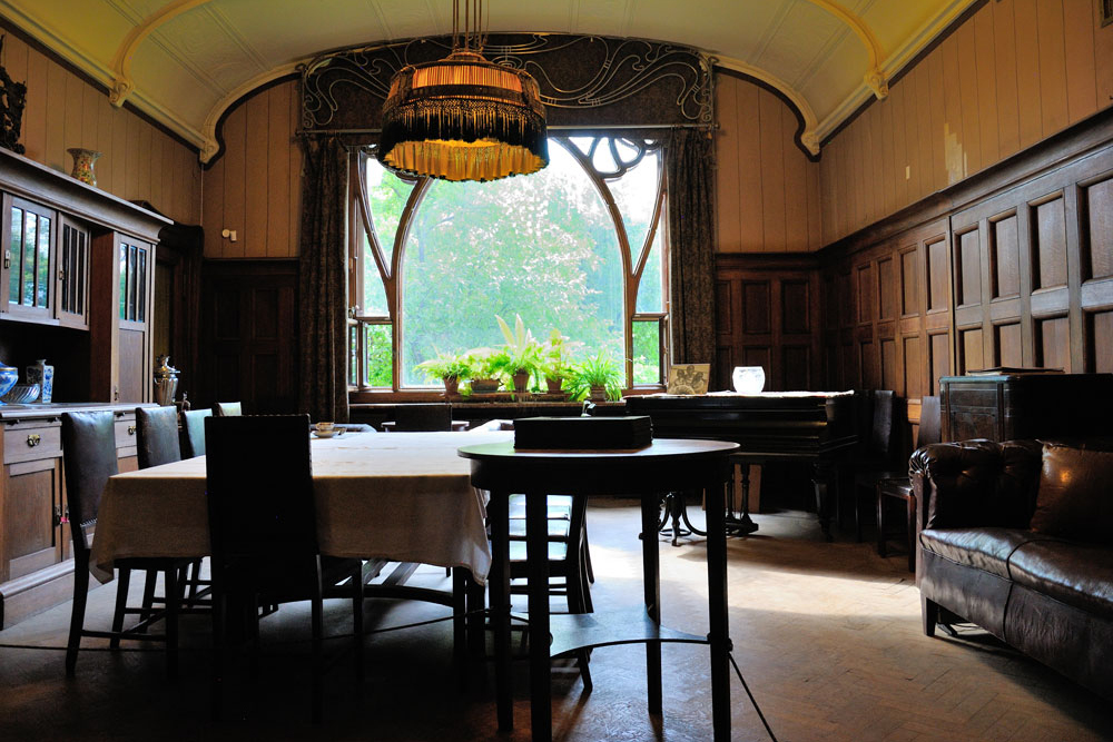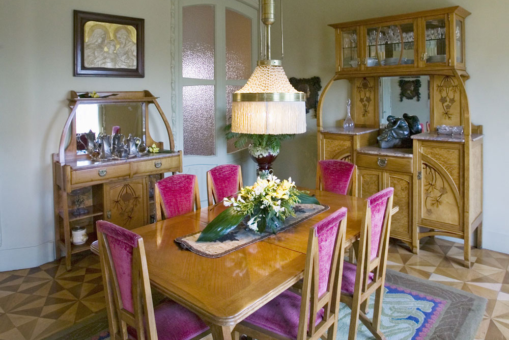 Такой интерьер изначально предполагаем искусную резьбу по дереву с элементами бионических форм и цветочных мотивов. Помните картины чешского художника Мухи, вот он источник качественного вдохновения, поэтому эта стилистика в принципе не бюджетная, очень плохо адаптивная для малометражных квартир, если не сказать жестче. Для дачного дома такой стиль подойдет, если вы планируете усадьбу или поместье. Но все же постараюсь найти элементы, которые станут приятным послаблением бюджета: 1) просто паркетный пол без художественных элементов; 2) винтажная мебель вместо дорогой итальянской.