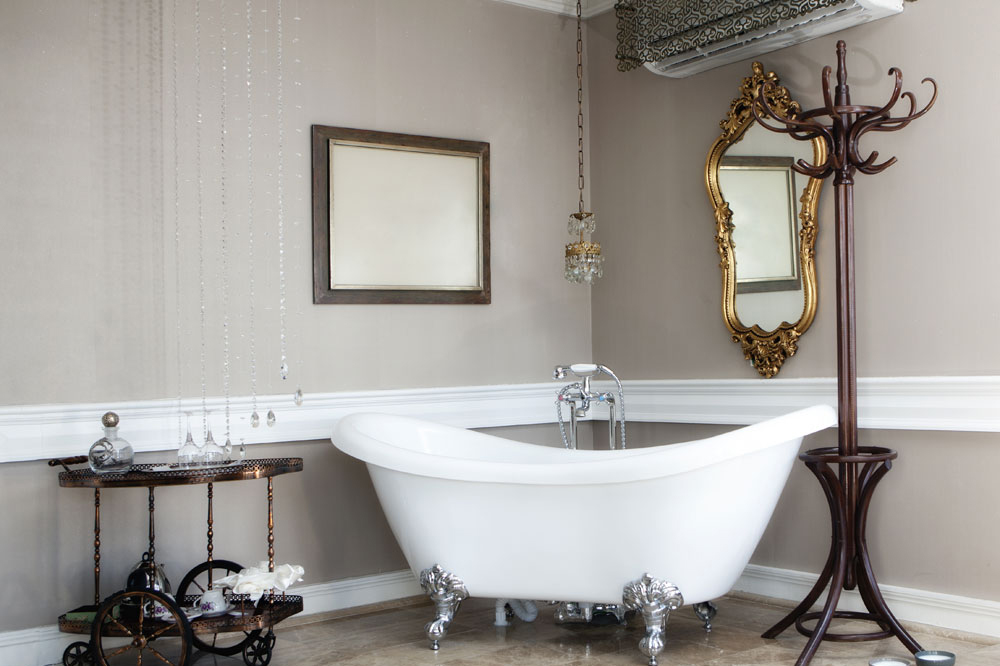 Стены окрашиваются в один тон, можно применять штукатурку или керамическую плитку. Наливной пол иногда украшается сложным рисунком. Главным элементом модерна в ванной комнате является сантехника. Могут использоваться нестандартные материалы, например, кованые, которые подбираются под цвет отделки. Хорошо смотрится сантехника футуристических форм. Эффект асимметрии создается за счет зеркал и точечного освещения. В качестве аксессуаров подбираются оригинальные полотенцесушители, искусственные цветы, вешалки для белья, оригинальные стаканы для зубных щеток.