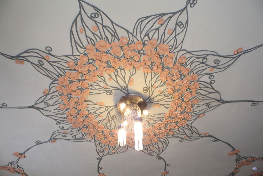 Отделке потолка уделяется особенное внимание. Часто используется рельефная лепнина и элементы из натурального дерева. Здесь также присутствует асимметрия, когда компоненты классического стиля сочетаются с волнистыми линиями и растительными узорами. На потолке могут располагаться витражи, которые, благодаря игре разноцветных стекол, создают особую атмосферу в квартире.