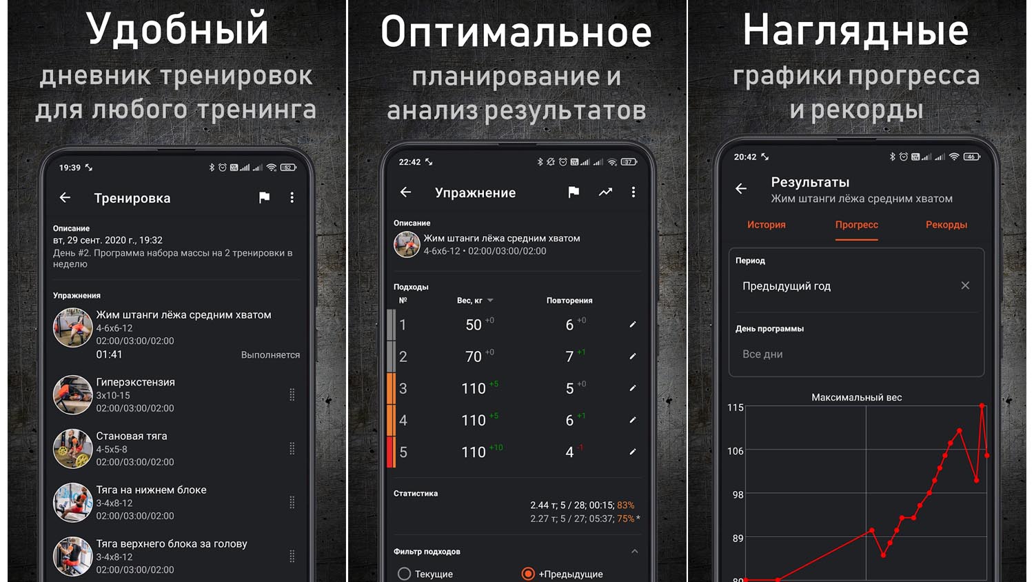Фильтры помогают подобрать тренировки для дома, тренажерного зала или улицы. Каждое упражнение сопровождается детальным описанием с фотографиями и видео. Во время занятий результаты фиксируются автоматически, историю можно просмотреть в дневнике, а прогресс — в специальном разделе с графиками. Для профессиональных тренировок предусмотрен специальный спортивный калькулятор. Данные можно экспортировать и импортировать.