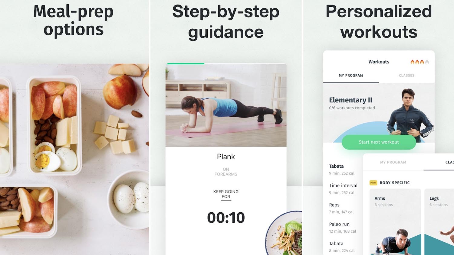 Для старта необходимо определить основную цель — снижение веса, коррекцию фигуры или набор мышечной массы. На основе этих данных формируется персональная программа тренировок и рацион. На выполнение комплекса упражнений в домашних условиях уходит всего 15-20 минут. В числе опций — шагомер (синхронизирован с Google Fit), консультации фитнес-тренера, мониторинг активности и отслеживание прогресса.