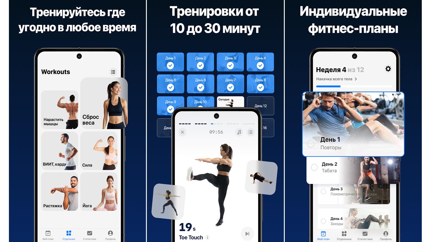 Продолжительность каждой сессии не превышает пяти минут. Доступны программы по йоге и фитнесу, не требующие специального оборудования. Приложение функционирует без подключения к интернету — идеально для путешествий и прогулок.