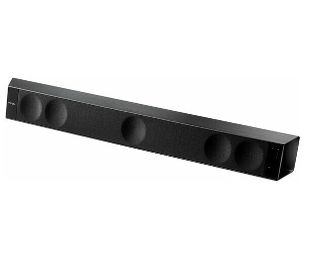 Эту модель можно порекомендовать тем, кто только начинает свой путь в мир домашнего кино и хорошего звука. Цена у саундбара просто смехотворно маленькая и никак не сочетается с прекрасными отзывами счастливых владельцев. Приятный светлый дизайн не выглядит дешево, да и звук очень даже ничего. Перечислим, что у него есть на борту: стандартный вход RCA (он же «тюльпан»), jack 3,5 мм, оптический вход, Bluetooth, а также восемь излучателей (4 активных и 4 пассивных). Устройство хорошо всем, кроме отсутствия двух важных вещей: пульта и входа HDMI. Придется немного побегать, чтобы, допустим, сменить источник звука. Ну, а HDMI — это все-таки золотой стандарт для передачи аудио- и видеоданных. Но за такие деньги ему можно простить всё.