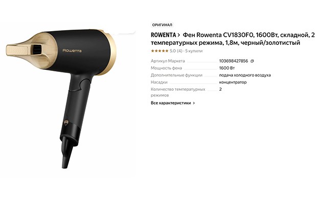 Достоинств у модели Rowenta Express Style достаточно много, обратить внимание стоит на удобную складную ручку небольших размеров. Кнопка регулировки скорости обдува расположена сзади — скорость легко переключать в процессе сушки одним движением пальца. Фен не только компактный, но и самый легкий из доступных вариантов профессиональной линии — без насадок весит всего 110 грамм.