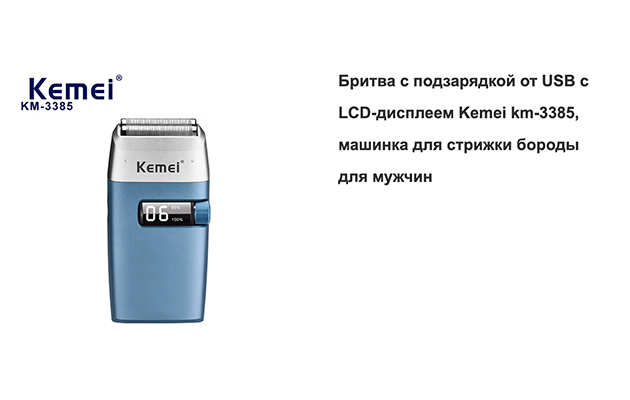 Инновационные технологии с практичностью использования сочетаются в электробритве Kemei KM-3385. Подвижная двойная сетчатая головка адаптируется к форме лица, делая бритье тщательным и комфортным. Мощный роторный мотор развивает большую скорость, быстро удаляя щетину. Используется сухой и влажный способ бритья. Предусмотрен двойной режим питания — от сети и автономно. Комплектация продумана для повседневного применения и путешествий: USB-кабель для подзарядки, чистящая щетка, смазка лезвий и удобный дорожный чехол.