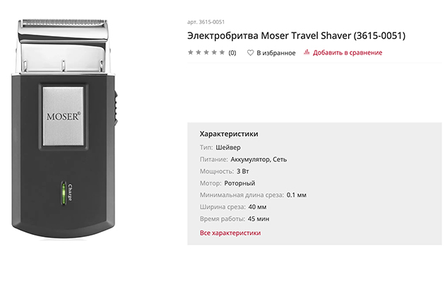 Сеточная электробритва бренда Moser используется для сухого бритья волос, по длине не превышающих 2-3 мм. Она не вызывает раздражения даже на чувствительной коже. Модель Travel Shaver (3615-0051) имеет один режущий элемент, мотор с мощностью до 5500 оборотов в минуту и плавающую головку.