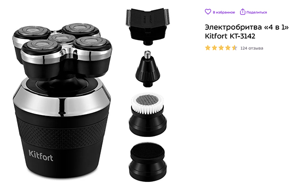 Электробритва российского производителя Kitfort отличается большим ассортиментом аксессуаров. Роторная насадка имеет четыре плавающие головки. Комплект также содержит: триммер для бороды и усов шириной 39 мм, куда крепятся насадки различной длины (3, 6, 9, 12, 15 мм), одна для стрижки у ушей, насадка для удаления волос в носу и ушах, две щетки для массажа лица (силиконовая и ворсистая), а также щетка для чистки лезвий, масло, расческа и USB-шнур длиной 0,5 м.