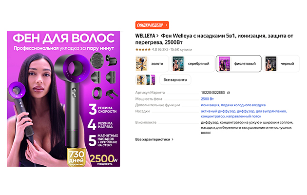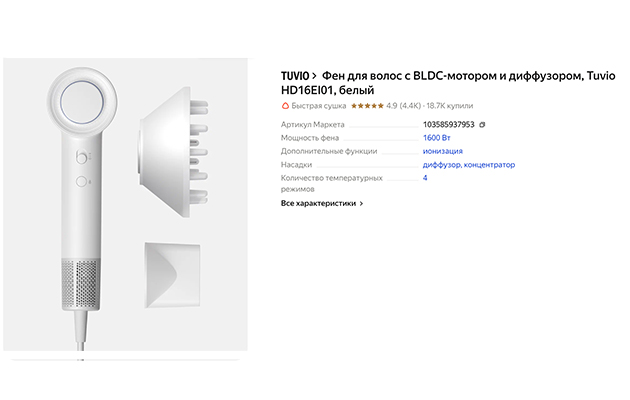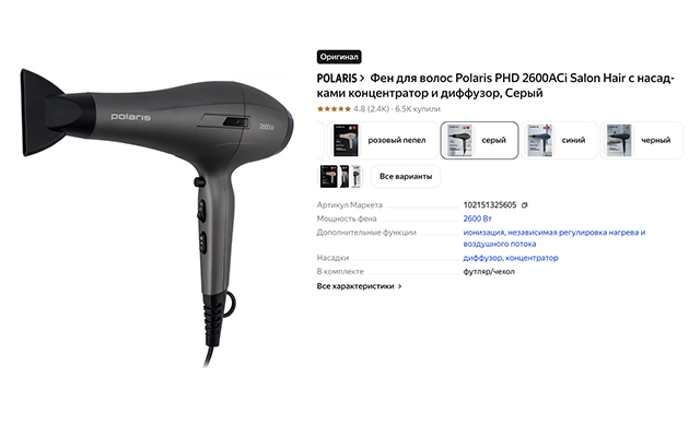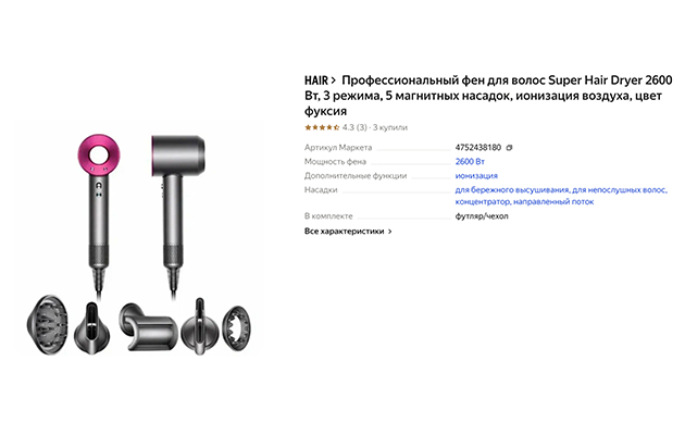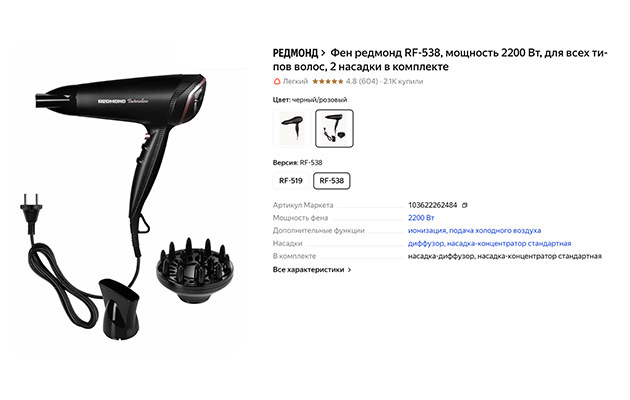 | Насадки | 5 штук: диффузор, 2 концентратора, для выпрямления, для бережной сушки |