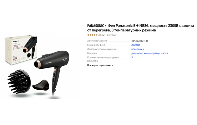 У фена высокая мощность 2300 Вт. В комплект устройства входит концентратор, диффузор и щетка-брашинг. Есть три температурных режима, два уровня скорости и встроенная система термозащиты. Холодный обдув комнатной температуры фиксирует готовую прическу.