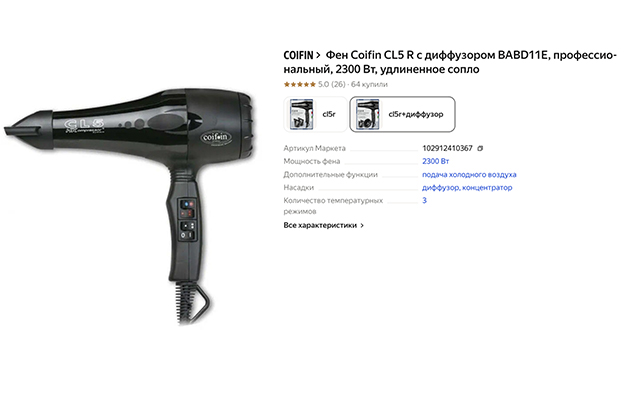 Фен марки Coifin оборудован мощным АС-мотором в 2300 Вт и сильным воздушным потоком в 152 км/ч для эффективной сушки волос и создания укладок. Им пользуются в парикмахерских, а также дома. В комплекте: диффузор и два концентратора: узкий — с направленным воздушным потоком для укладки, со скошенным краем — для более мощного и точного потока.
