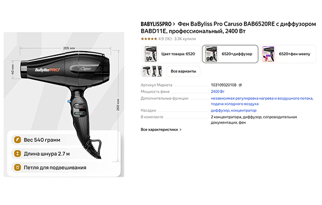 | Насадки | 5 штук: диффузор, 2 концентратора, для выпрямления волос, для бережной сушки |