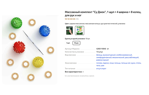 Су-Джок терапия основана на стимуляции активных точек, связанных с внутренними органами. Щуп используется для точечного воздействия, а шарики и кольца — для мягкого массажа и улучшения кровообращения. Регулярное применение способствует снятию напряжения, облегчает симптомы усталости, помогает при головных болях, нарушениях сна и дискомфорте в суставах.