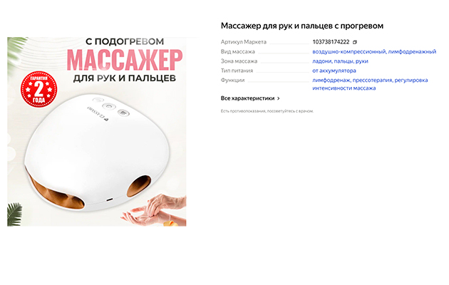 Массажер комплексно подходит к проблеме онемения пальцев и болей в суставах. Разработчики совместили разминающую функцию, воздушно-компрессионное и тепловое воздействие. Инфракрасных подогрев охватывает температурные режимы 34-37 и 40-43 градуса. Есть таймер, обеспечивающий автоматическое отключение через 20 минут. Прибор оснащен встроенным аккумулятором и панелью сенсорного управления. Разработчики видят плюс в небольших размерах, что делает девайс легким в транспортировке: он буквально помещается в дамскую сумочку. При этом некоторые пользователи более скептичны и находят массажер комфортным только для обладателей небольших рук.
