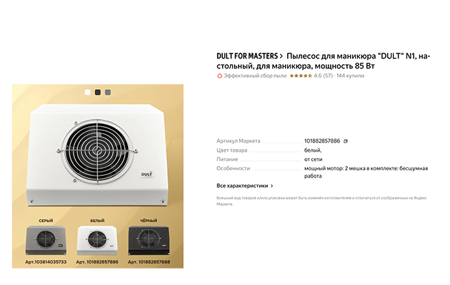 DULT N1 — это компактная вытяжка для маникюра, предназначенная для удаления пыли и запахов во время работы с покрытием. Она оснащена мощным вентилятором, который эффективно устраняет мусор от спила и обеспечивает чистый воздух в рабочем пространстве. Вытяжка имеет удобную конструкцию, легко монтируется на стол и не занимает много места. Благодаря своей надежности и функциональности, DULT N1 станет незаменимым помощником для профессиональных мастеров маникюра.