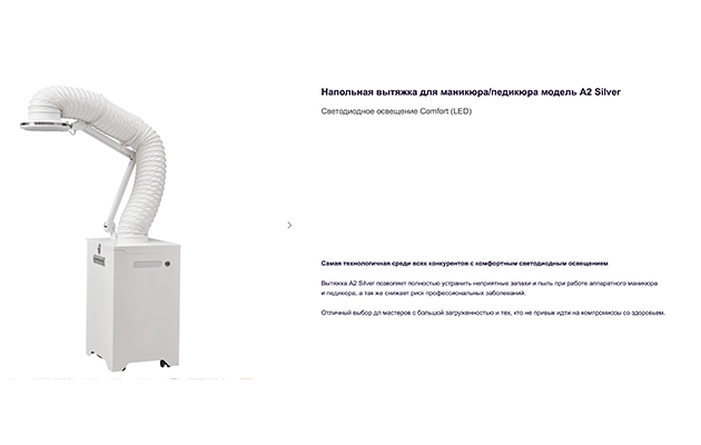 Эта вытяжка создана специально для педикюра и продумана до мельчайших деталей. Она устойчиво располагается на полу, а высота подставки регулируется. Прямо на вытяжке есть подушка для ноги клиента, расположенная под таким углом, чтобы максимальное количество пыли попадало прямиком в вытяжку. Производитель предлагает пылесос в нескольких дизайнах — каждый мастер сможет подобрать аппарат под цвет своего педикюрного кресла.