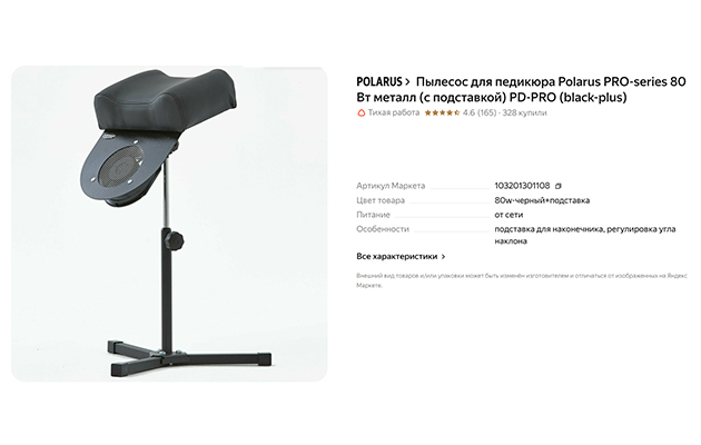Высота этой напольной подставки легко регулируется колесиком. На вытяжке предусмотрена подушка с углублением для удобного и статичного положения ноги клиента. В отзывах отмечают, что независимо от положения ноги, вся пыль летит в вытяжку. Но некоторые говорят и то, что мощности маловато для смарт-педикюра. Вытяжка представлена в двух цветах — белом и черном.