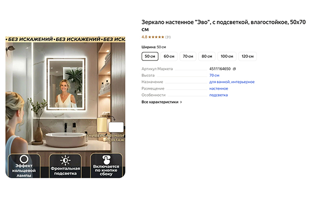 На этапе заказа производитель дает возможность выбрать зеркало по ширине (60, 61, 80 см), цвету рамы (бежевый, белый) и ориентации (горизонтальная и вертикальная). По периметру располагаются лампы. Они не входят в комплект, рекомендуется брать нейтральной температуры для более естественного освещения. Лампы равномерно освещают лицо, делая процесс нанесения макияжа не только удобным, но и с результатом, который в большинстве случаев действительно радует. Бьюти-девайс можно разместить как дома, так и в салоне красоты или ресторане. Лаконичный и эстетичный вид встраивается в любой интерьер. Покупатели отмечают качество упаковки: в случае с хрупким товаром это очень важный аспект. В размере 61х95 есть полочка.